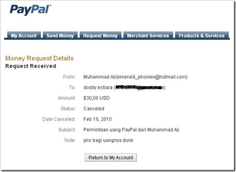 Beberapa waktu lalu ada permintaan uang (bill) yang datang dari seseorang yang aku tidak kenal di akun paypal-ku. Untung aku membaca lagi detail isinya dengan teliti ya, karena tidak merasa punya urusan dengan seseorang mengenai suatu pelayanan atau pembelian. Akhirnya permintaan itu aku tolak. Permintaan uang itu datang dari Muhammad Aji (emerald_phoniex@hotmail.com)
